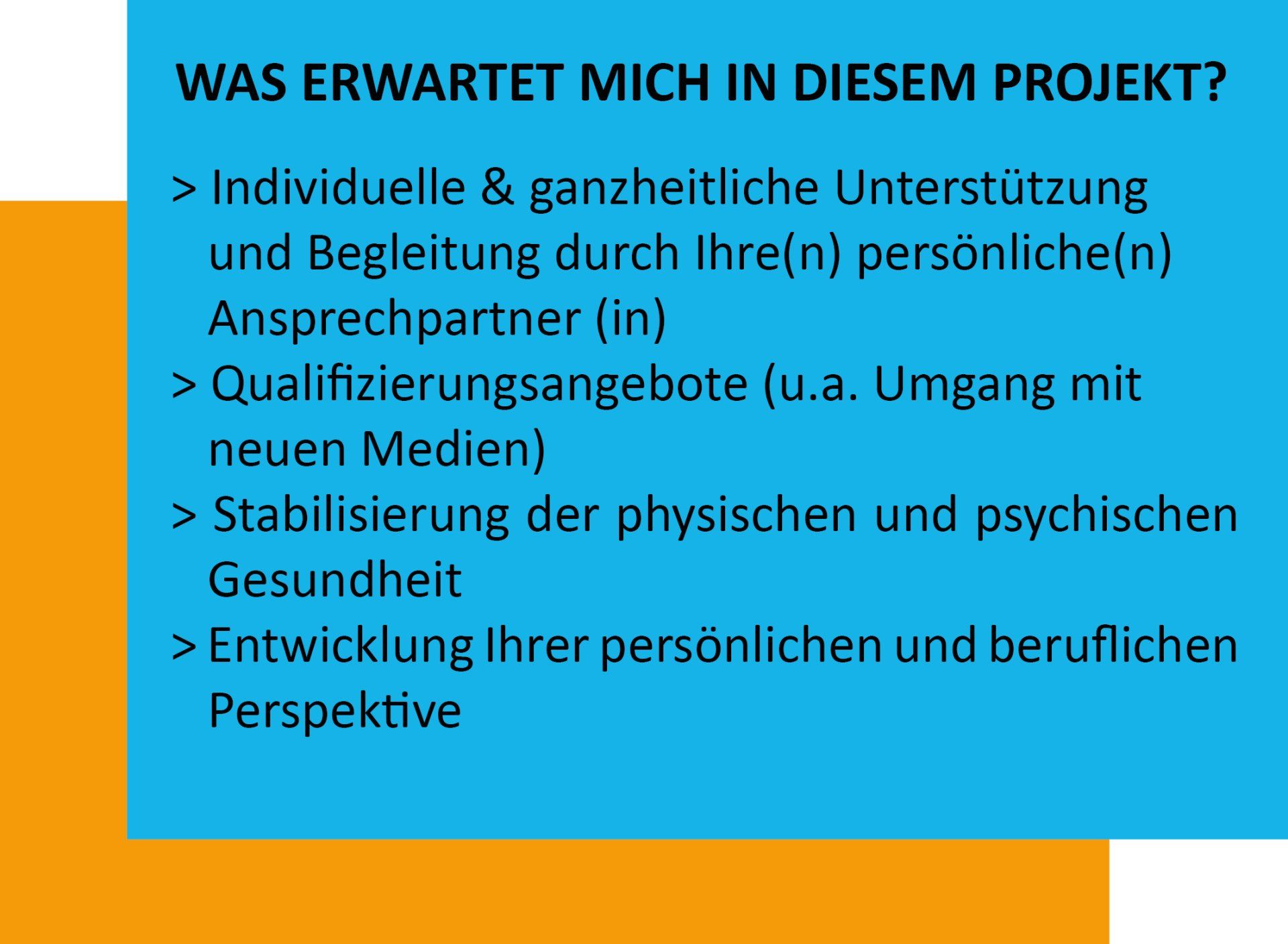 Wir nehmen Ihre Problemlagen mit Ihnen in den Blick. Gemeinsam mit Ihrem Jobcenter gehen wir neue Wege, um Sie bei Ihrem Wiedereinstieg ins Erwerbsleben tatkräftig zu unterstützen.